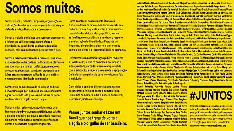 Muita gente que eu respeito e admiro assinou o manifesto #SomosMuitos. E muita gente querida me pergunta por que me recusei a assiná-lo. Eu o fiz basicamente por duas razões: primeiro por considerá-lo, com todo o respeito a quem redigiu, acaciano e truista. Cheguei a dizer, ao amigo que me convidou, que parecia um documento contra o câncer, a favor da água encanada e da luz elétrica – quem não assinaria? Segundo porque, a esta altura da vida, não subscrevo nada ao lado, entre outras, de pessoas como (por ordem alfabética) o Cardeal Odilo Scherer, Elena Landau, Joel Pinheiro da Fonseca, Júlio Delgado, Kati Almeida Braga, Lobão, Luciano Huck, Luiz Felipe Pondé, Marcelo Tas, Miguel Reale Júnior, Reinaldo Azevedo, Roberto Duailibi, Roberto Freire e Washington Olivetto. O Brasil que eu quero não é o que essa gente quer.