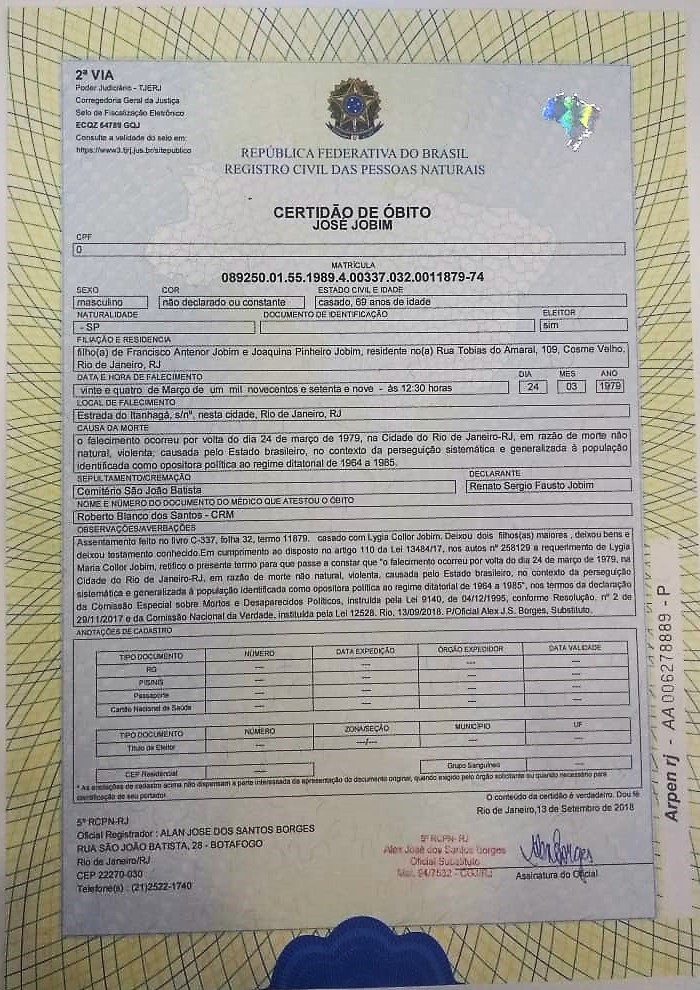 A nova certidão corrige o motivo de óbito de Jobim: “O falecimento ocorreu por volta do dia 24 de março de 1979, na Cidade do Rio de Janeiro-RJ, em razão da morte não natural, violenta, causada pelo Estado brasileiro, no contexto da perseguição sistemática e generalizada à população identificada como opositora política ao regime ditatorial de 1964 a 1985”.