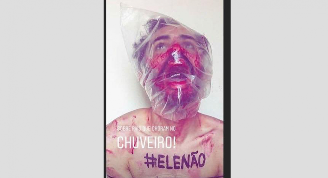 Na imagem vemos a pessoa sendo torturada por asfixia com a hashtag #EleNão escrita e a frase “sobre pais que choram no chuveiro” que é comumente usada por homofóbicos para dizer que pais tem vergonha de seus filhos gays.