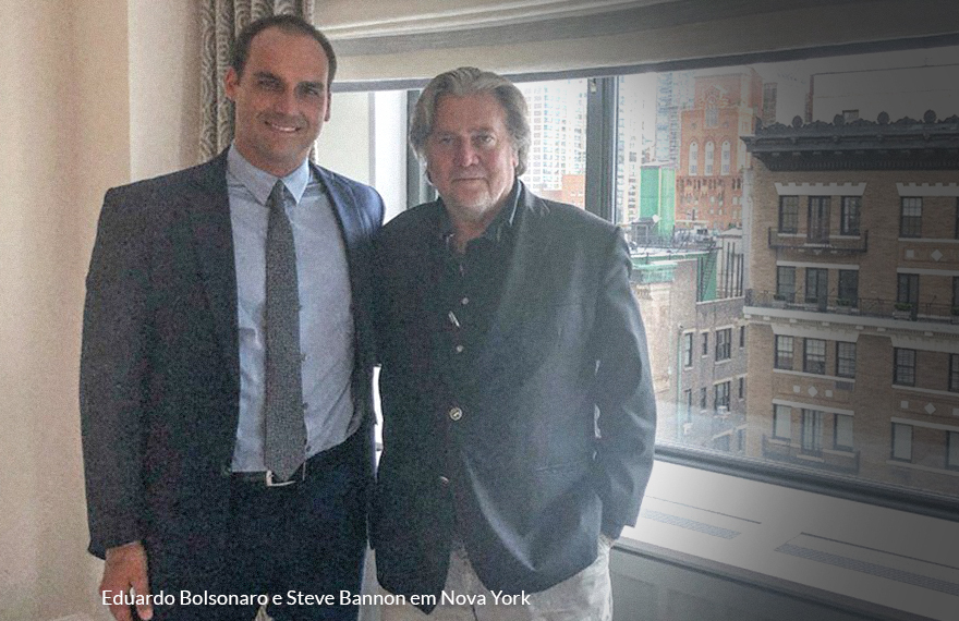 Pois bem, ele se encontrou em agosto com Eduardo Bolsonaro. Bolsonaro disse que o Bannon apoiaria a campanha do seu pai com suporte e “dicas de internet”, essas coisas. Bannon é agora um “consultor eventual” da campanha. Era o candidato ideal pra ele, por compartilhava suas ideias, no cenário ideal: um país passando por uma grave crise econômica com a população desiludida com a sua classe política.