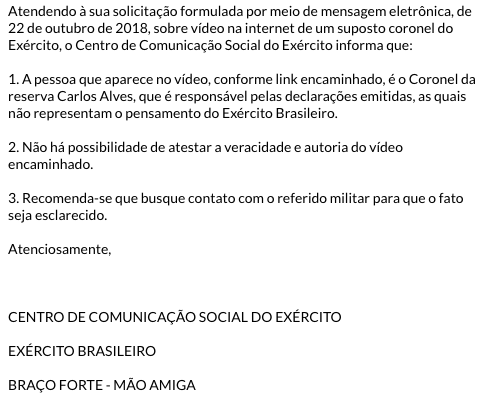Em vídeo publicado no Youtube o coronel Carlos Alves de Lima Filho ameaça fechar o Supremo se Haddad for eleito e afirma que o exército colocou um general como secretário de Toffoli para o ministro “fazer xixi dentro do penico”. Consultado pela reportagem, o Centro de Comunicação Social do Exército afirmou que “a pessoa que aparece no vídeo é o Coronel da reserva Carlos Alves, que é responsável pelas declarações emitidas, as quais não representam o pensamento do Exército Brasileiro”.