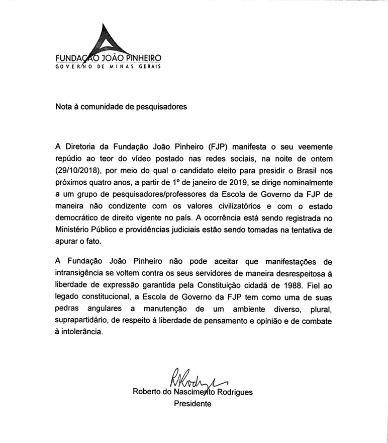 “A Fundação João Pinheiro não pode aceitar que manifestações de intransigência se voltem contra os seus servidores de maneira desrespeitosa à liberdade de expressão garantida pela Constituição cidadã de 1988”, diz trecho da nota.