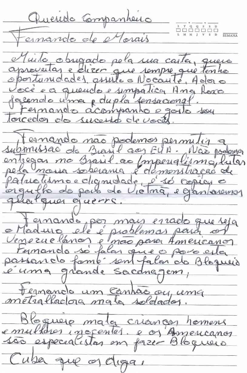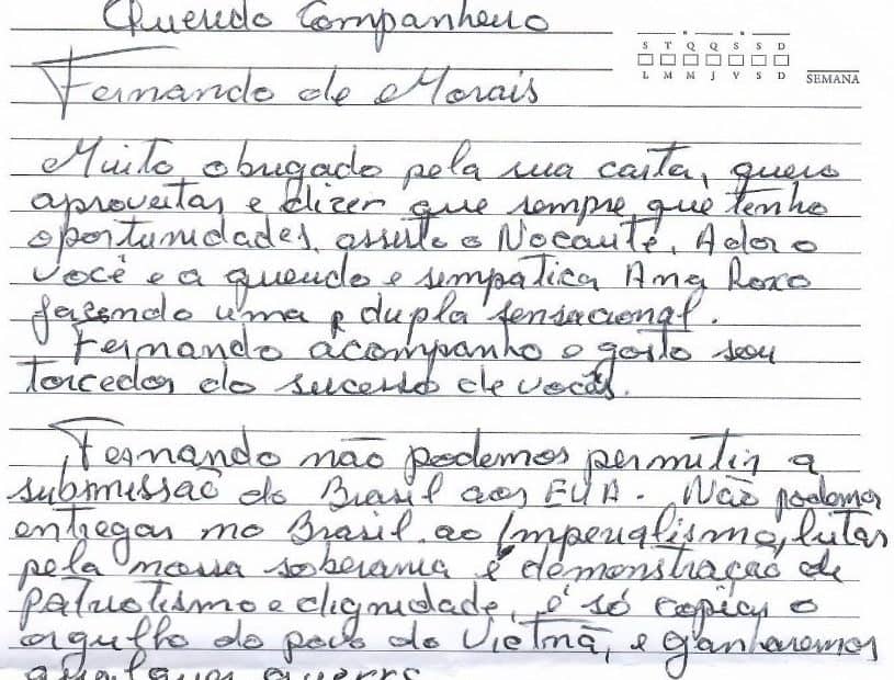 Muito obrigado pela carta. Quero aproveitar e dizer que sempre que tenho oportunidade assisto o Nocaute. Adoro você e a querida e simpática Ana Roxo fazendo uma dupla sensacional. Fernando, acompanho, gosto e sou torcedor do sucesso de vocês.