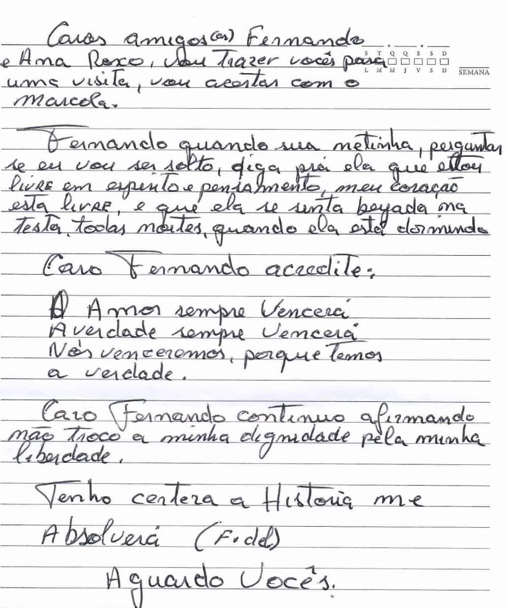Fernando, quando sua netinha perguntar se eu vou ser solto, diga para ela que estou livre em espírito e pensamento, meu coração está livre. E que ela se sinta beijada na testa, todas as noites, quando ela está dormindo.
