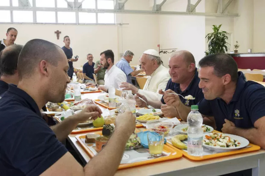 A segunda decisão de Francisco não precisou de anúncio, foi uma aparição. Seu primeiro almoço como papa não aconteceu no salão de refeições do Palácio Apostólico, mas no bandejão que serve aos trezentos funcionários da Santa Sé – um terço da população do Estado do Vaticano. O Papa enfrentou a fila, de bandeja na mão, escolheu batatas fritas, peixe, pão integral e água e sentou-se em uma das dezenas de mesas compridas, ao lado dos trabalhadores. O costume de aparecer de surpresa no bandejão e almoçar ou jantar com os funcionários acabou tornando-se corriqueiro.
