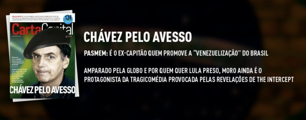 A revista Carta Capital chegando às bancas com uma foto de Bolsonaro na capa, como se fosse um Hugo Chávez ao avesso. Na Veja, a matéria de capa fala do governo paralelo que o presidente da Câmara, Rodrigo Maia, instalou em Brasília. Vale pelo trocadilho na manchete: “O calendário Maia”.