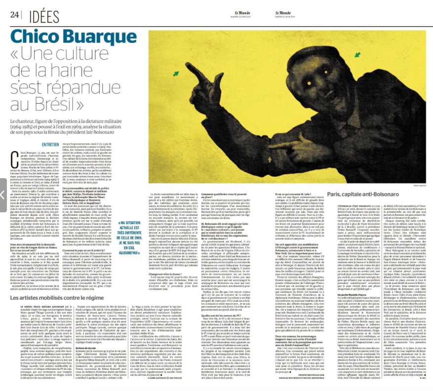 Pelo mundo, uma entrevista de duas páginas com Chico Buarque na edição de fim de semana do jornal francês Le Monde, com direito a chamada – com foto – na primeira página. A frase de Chico que foi pra manchete da reportagem: “Uma cultura de ódio se espalhou pelo Brasil”.