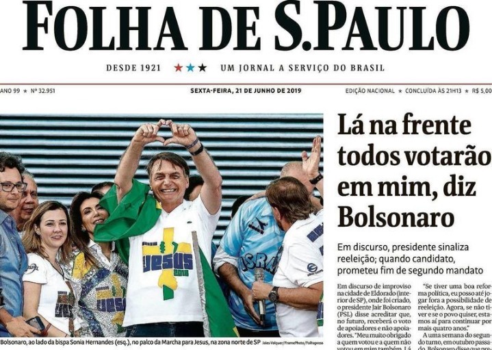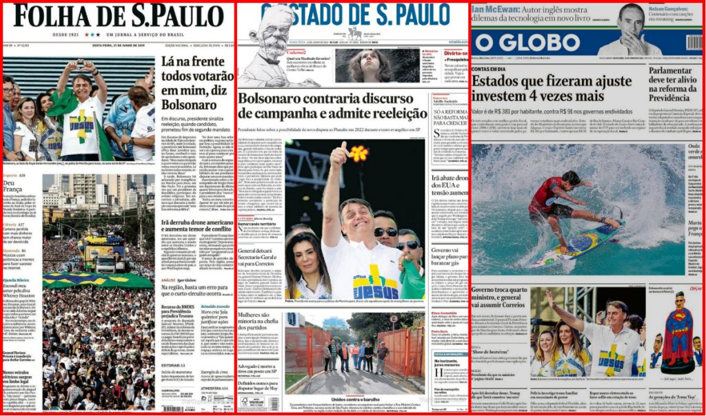 Folha e Estadão preferiram dar na manchete principal, a primeira indireta do presidente da República no quesito reeleição. Os jornais citam apenas que, durante a campanha, ele chegou a cogitar em derrubar “essa coisa ai de reeleição”, mas nenhum foi crítico, afirmando que, um desgoverno de seis meses de trapalhadas, já está de olho em 2022 com o objetivo de continuar no poder.