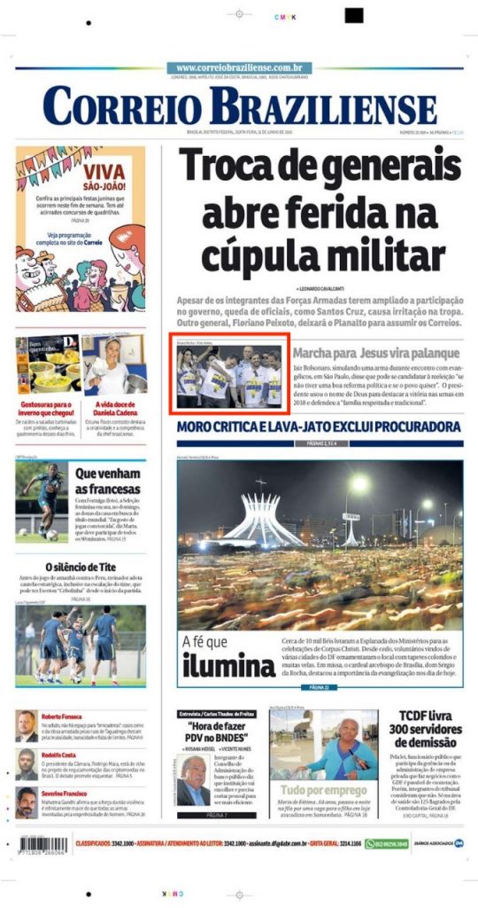 Na Folha, aparece um Bolsonaro simpático e sorridente, fazendo sinal de coraçãozinho. No Estadão, ele aparece, também sorrindo, fazendo sinal de positivo e, no Globo, saudando a multidão. Apenas o Correio Braziliense publicou a foto em posição de tiro na primeira página, discretíssima, quase uma 3X4.