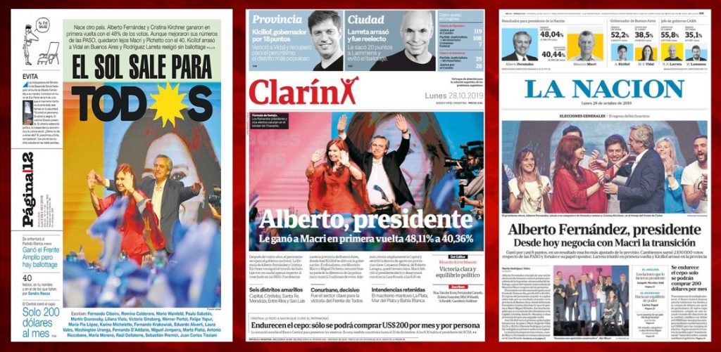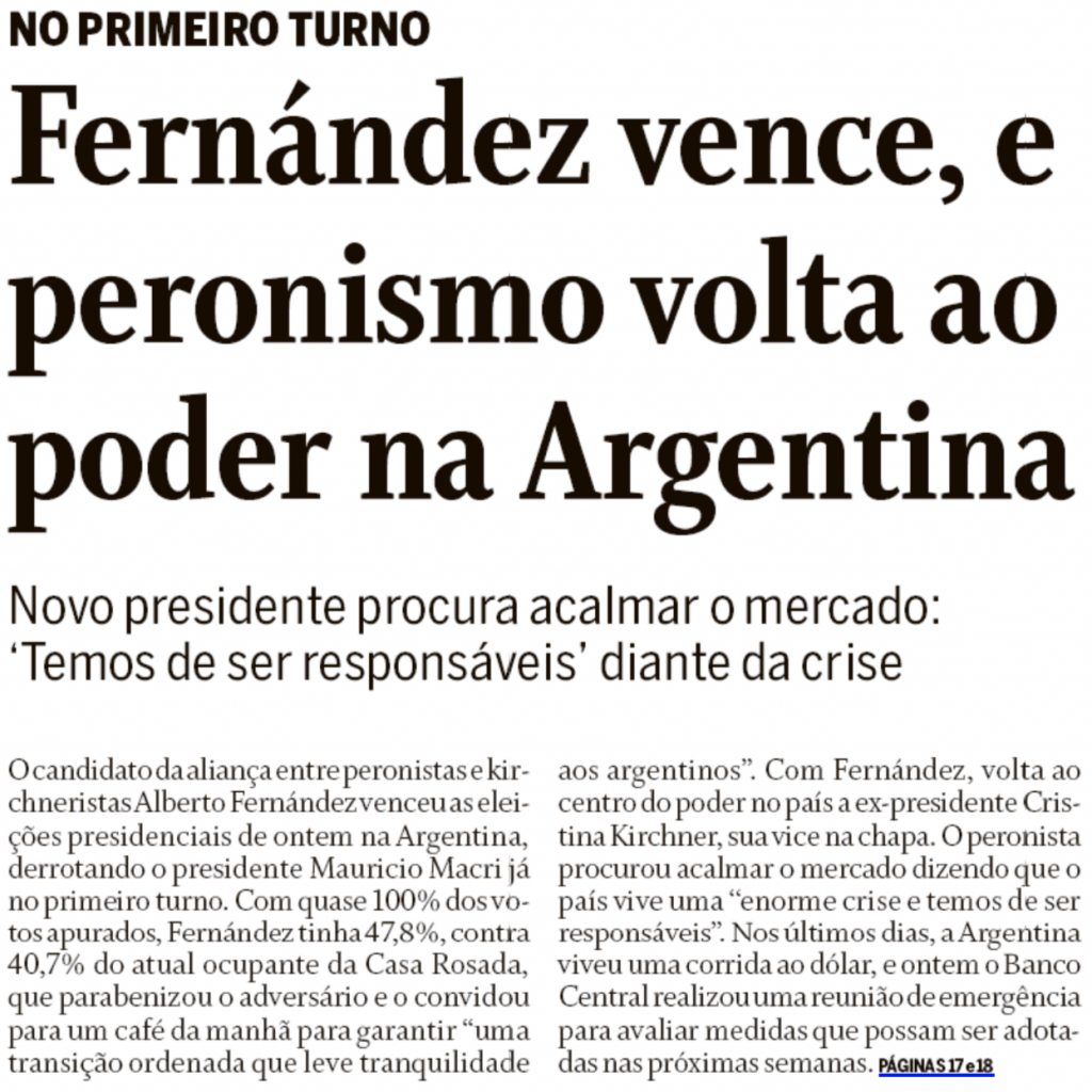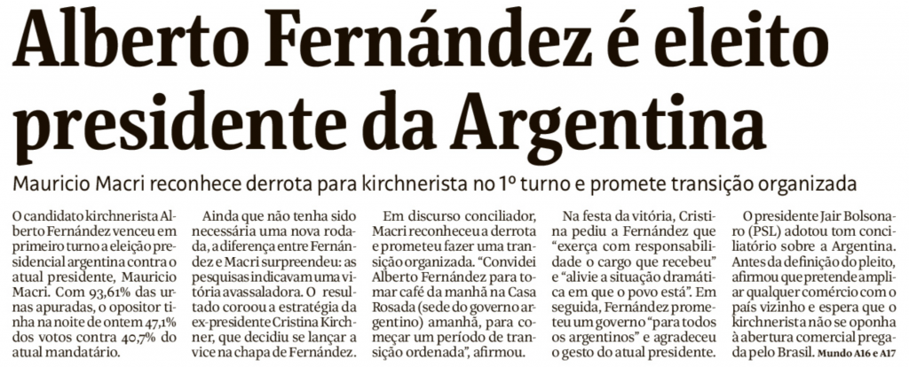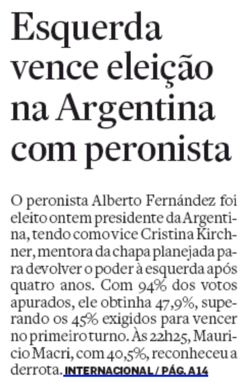 A Folha escancara que Macri caiu e estampa a foto de Fernández, o eleito, fazendo o L de Lula Livre. O Globo anuncia a volta do peronismo e o Estadão esconde de seus leitores a vitória da oposição na Argentina, e não dá como manchete principal.