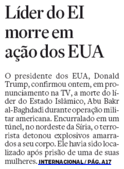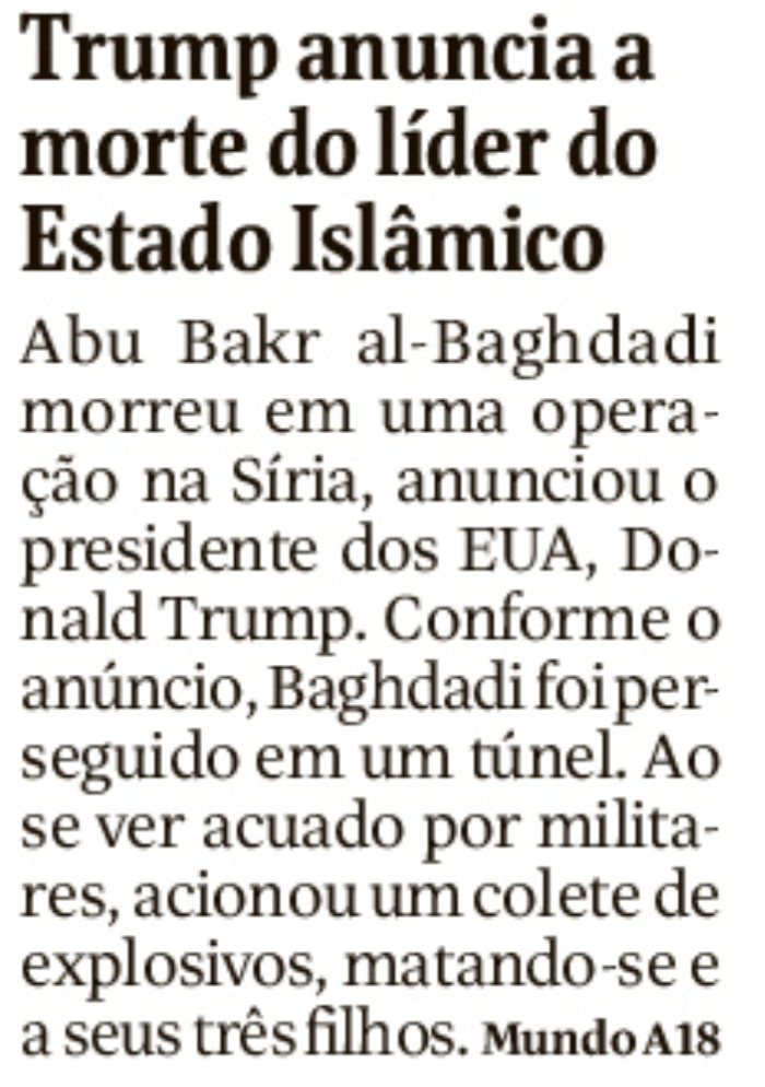 A morte de Abu Bakr al-Baghdadi, líder do Estado Islâmico, anunciada pelos Estados Unidos, ganhou destaque na Folha e no Estado.