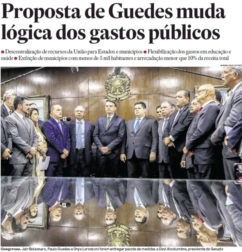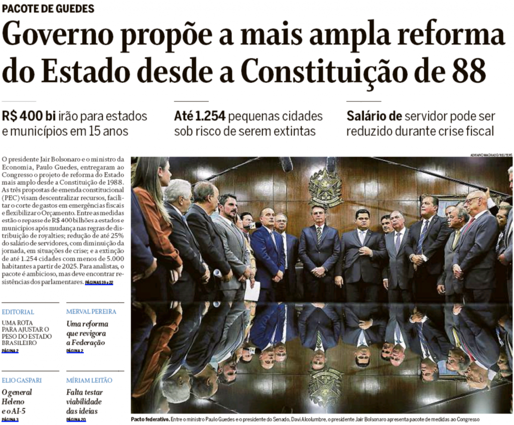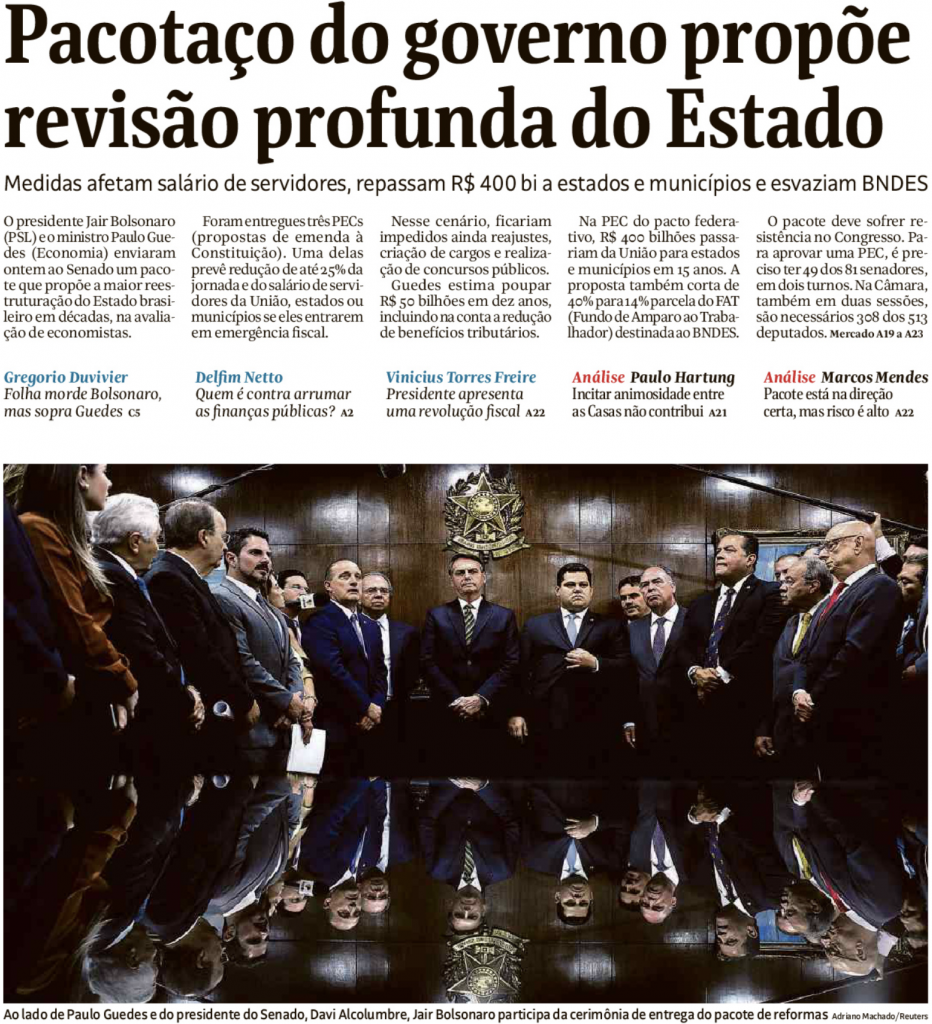 A mesma foto publicada nos três principais jornais do país nesta quarta feira, é o retrato do governo do Seu Jair: Apenas homens brancos engravatados na entrega do pacotes de medidas que, segundo eles, vão salvar a pátria. Apenas uma mulher aparece na foto.
