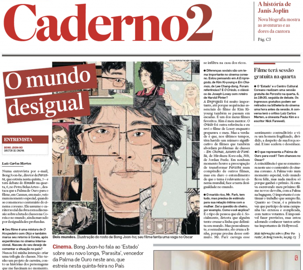 Na capa do Caderno 2, do Estadão, uma entrevista com Bong Joon-ho, diretor do filme “Parasita”, que estreia quinta no Brasil. Vale muito ver.