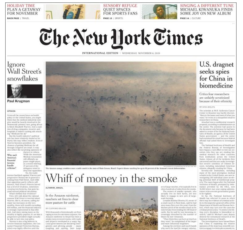A floresta Amazônica volta à primeira página do New York Times. Por aqui, a floresta e a fumaça já foram esquecidas.