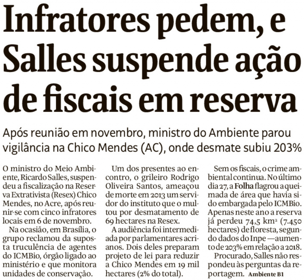 A Folha chegou às bancas com uma bomba em sua manchete principal. A denúncia de um acordo entre o ministro Ricardo Salles e infratores do Acre. Na manchete: