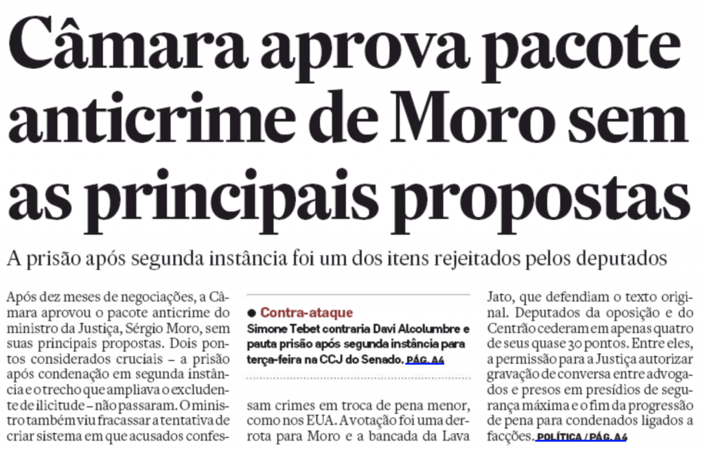 Manchete principal do Estadão: “Câmara aprova pacote anticrime de Moro sem as principais propostas”
