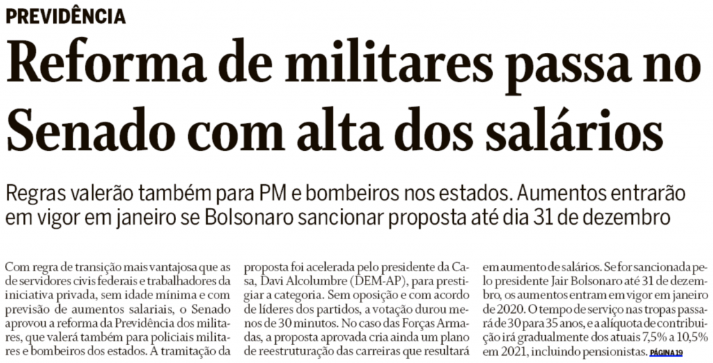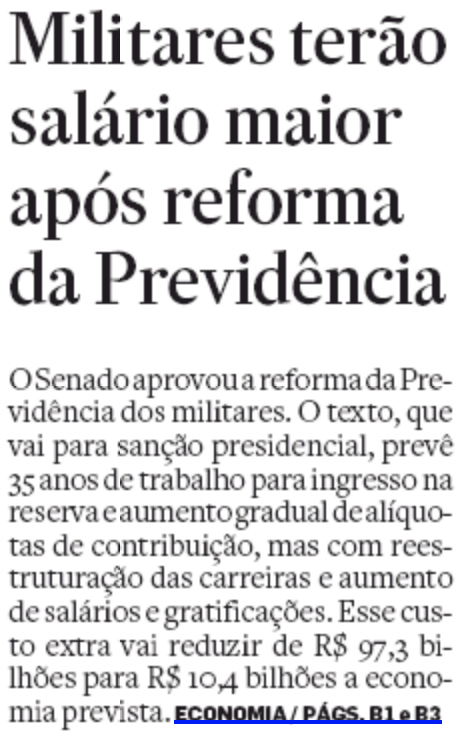 No Globo: “Reforma de militares passa no Senado com alta dos salários”