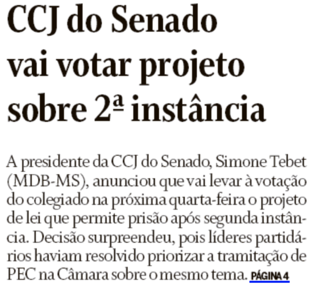 “CCJ do Senado vai votar projeto sobre 2a. instância”