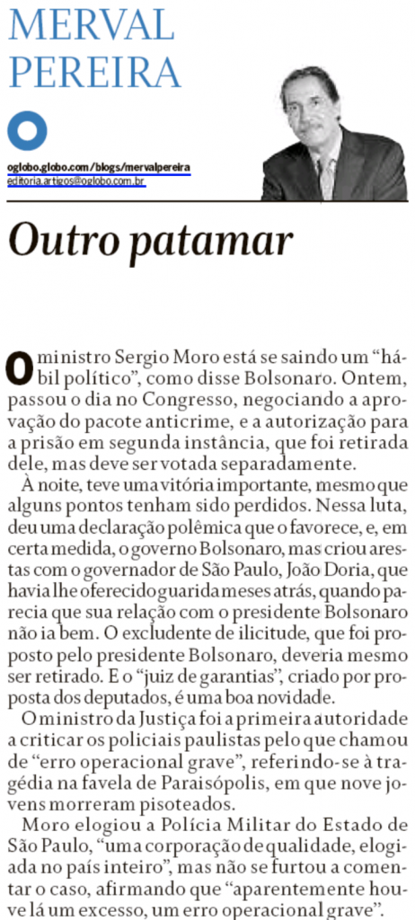 O imortal Merval Pereira faz, em sua coluna, o papel de assessor de imprensa do ministro da Justiça Sérgio Moro. Só elogios.
