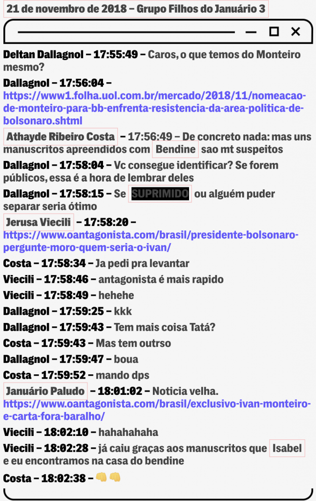 As mensagens trocadas via Telegram não deixam claro porque – e, questionado a respeito, Dallagnol se recusou a responder –, mas no fim de tarde de 21 de novembro de 2018 ele enviou ao grupo do Telegram Filhos do Januario 3 uma reportagem da Folha que citava a insatisfação de Onyx Lorenzoni com o então presidente da Petrobras Ivan Monteiro. O procurador acionou os colegas em busca de informações que pudessem desabonar Monteiro.