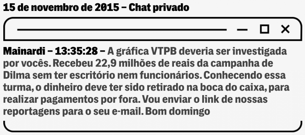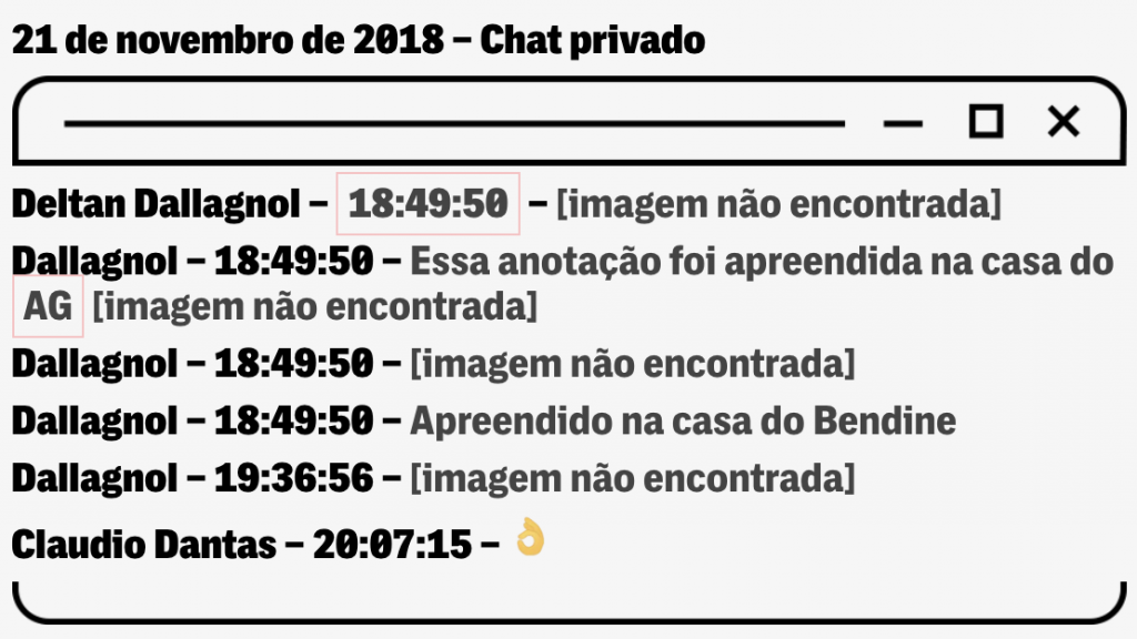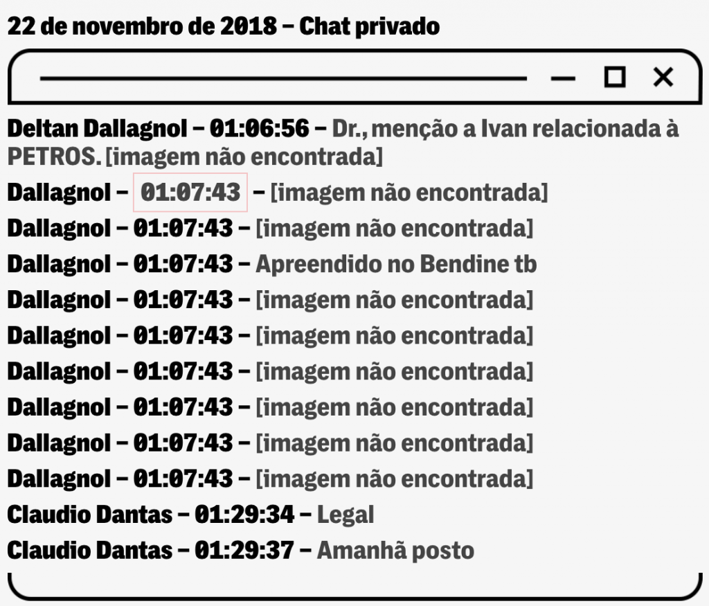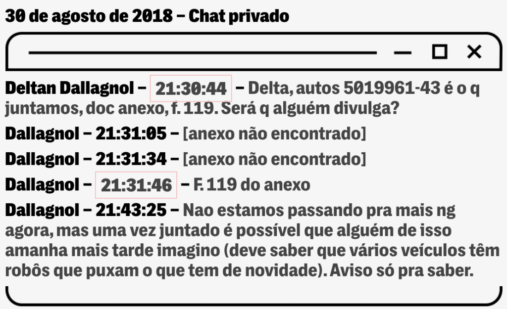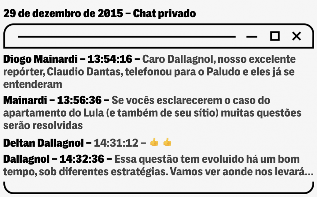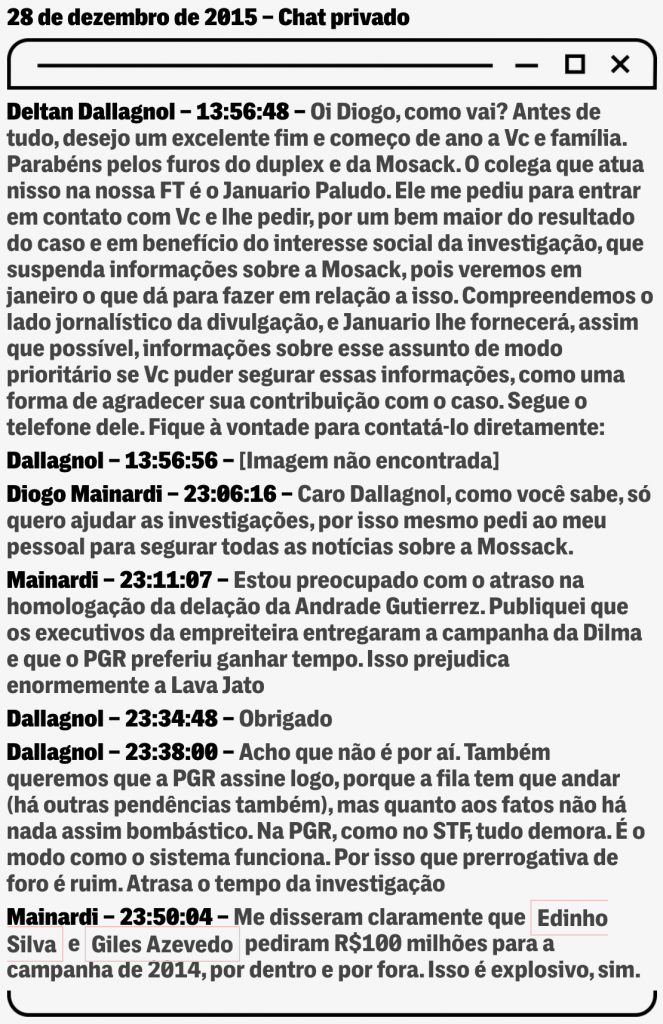 Dallagnol, então, retornou com a resposta a Mainardi. “Pra nós é novidade”, escreveu, às 18h33 daquele dia. “Bom saber”, agradeceu. No dia seguinte, o jornalista seguiu a insistir que a Lava Jato se debruçasse sobre o caso: