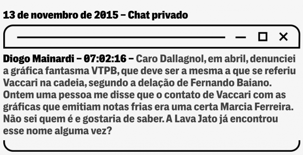 DIOGO MAINARDI TAMBÉM SE SENTIA À VONTADE para dar palpites à Lava Jato sobre o rumo de investigações. Em novembro de 2015, ele sugeriu ao procurador que buscasse pelo nome de “uma certa Marcia Ferreira”, que dizia ser um elo entre o ex-tesoureiro do PT João Vaccari, à época já condenado na Lava Jato, e gráficas sob suspeita de ligação com o partido: