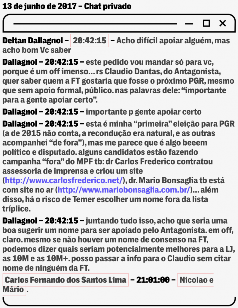 A força-tarefa da Lava Jato temia que o novo chefe do MPF tentasse limitar suas ações, uma vez que Temer era alvo das investigações. Dias antes da eleição, Dallagnol relatou ao colega Carlos Fernando dos Santos Lima, o decano da operação, “um off imenso” que recebera a respeito da sucessão na PGR. Vinha de Claudio Dantas, repórter de O Antagonista. Hoje aposentado, Santos Lima costumava ser consultado sobre decisões estratégicas da força-tarefa.