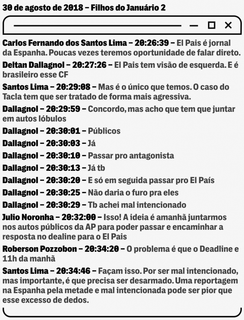 O El País havia pedido resposta à Lava Jato com deadline (prazo-limite) às 11h do dia 31 de agosto de 2018. Na noite anterior, às 20h26, a manifestação do MPF já havia sido aprovada no grupo Filhos do Januario 2 e estava pronta para ser dada ao jornal. Dallagnol, no entanto, decidiu que o Antagonista – que não havia feito qualquer pedido sobre o tema – merecia furar a fila.