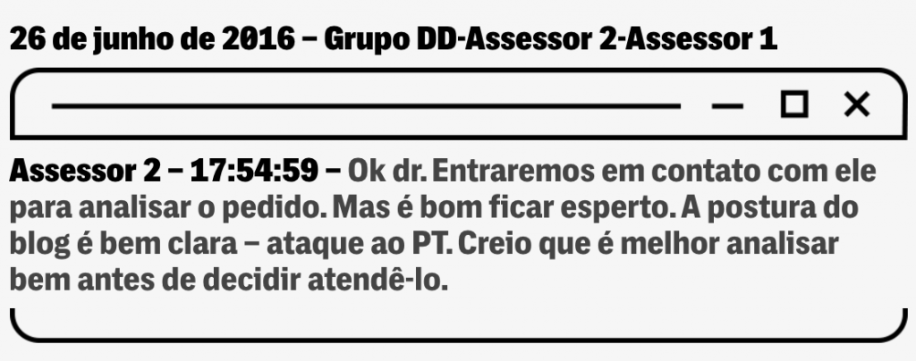 Meses depois, em fevereiro de 2017, Assessor 1 resumiria a Deltan Dallagnol em um chat privado o que levava os voluntários que haviam encampado o projeto das Dez Medidas Contra a Corrupção a compartilharem do entusiasmo dele pelo site: “Antagonista faz tanto sucesso com grande parte dos voluntários porque compartilham raciocínio e objetivo: o problema da corrupção é o PT e Lula na cadeia resolve”, escreveu, em 4 de fevereiro de 2017.
