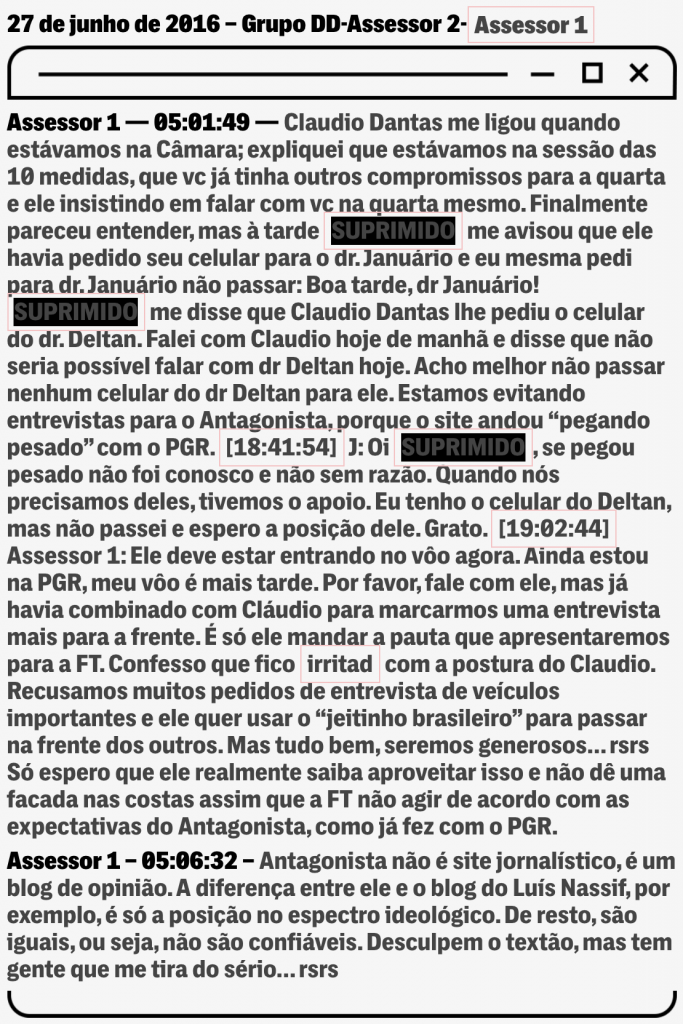 Também havia, entre procuradores da República, quem compartilhasse da visão dos assessores de imprensa da Lava Jato. Num chat chamado BD, o procurador Angelo Augusto Costa escreveu, em 8 de setembro de 2015: “Esse negócio do antagonista é simples: a PF abastece esse cara de informações, e ele só ouve o lado da fonte que o ajuda. Acho que ele eh irrelevante, pois os “donos” da parada são os outros dois, que têm um projeto político ou, pelo menos, um projeto editorial com fins políticos”. Referia-se, respectivamente, a Claudio Dantas, Diogo Mainardi e Mário Sabino.