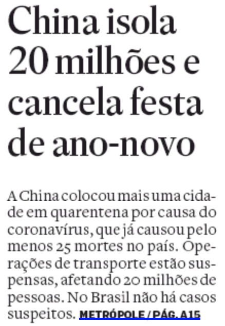 China isola 20 milhões e cancela festa de ano-novo (Estadão)