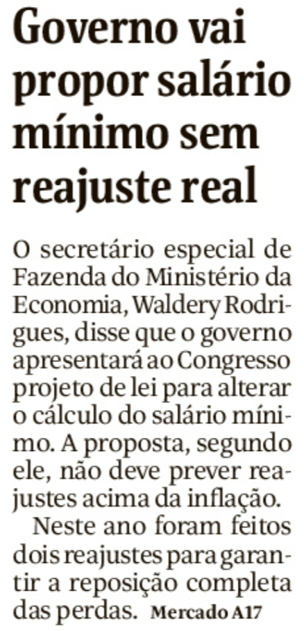 Governo vai propor salário mínimo sem reajuste real (Folha)