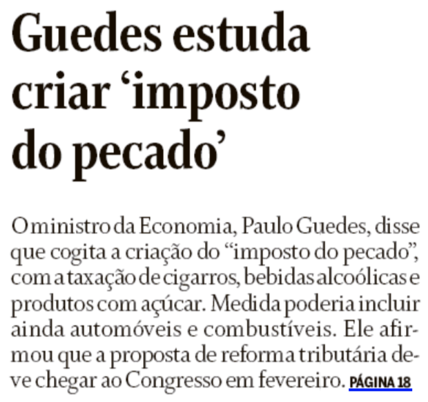 Guedes estuda criar imposto do pecado (O Globo)