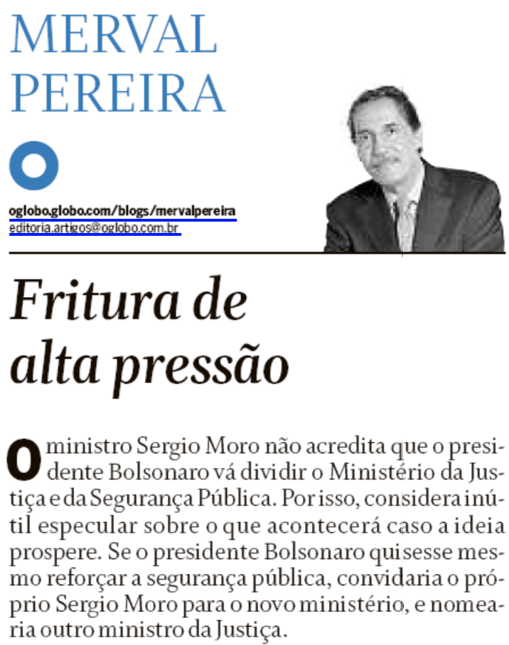 No Globo, o imortal Merval Pereira conta como Bolsonaro está fritando Sergio Moro.