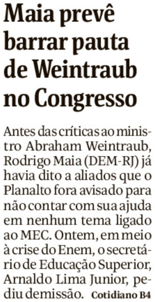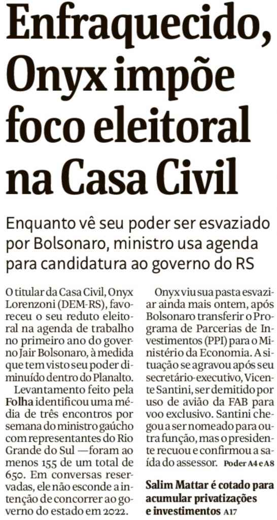 Manchete de primeira página: “Enfraquecido, Onyx impõe foco eleitoral na Casa Civil”