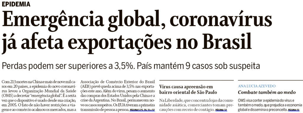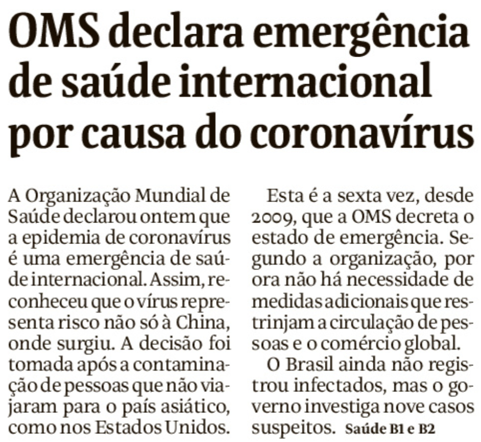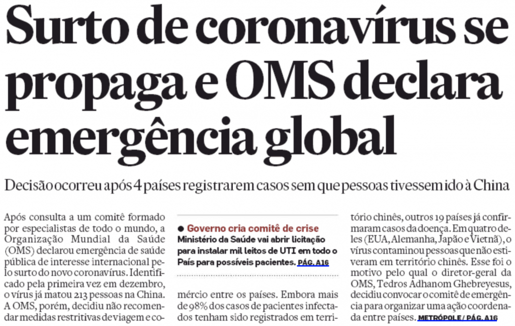“OMS declara emergência de saúde internacional por causa do coronavírus”. Assunto que está nas manchetes principais dos outros dois jornais, Globo e Estadão.