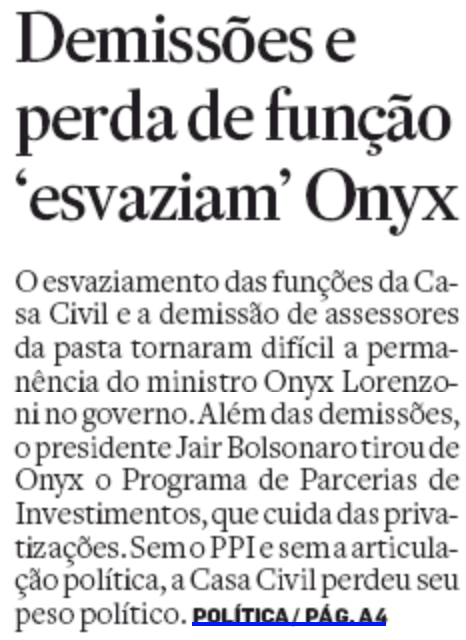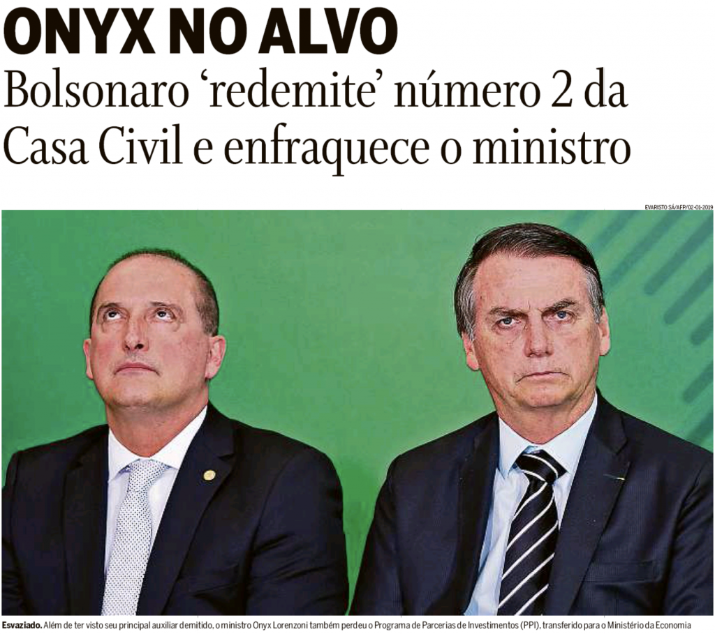 Onyx está na página 4. O Globo inventou uma nova palavra, em vigor no governo Bolsonaro: “Bolsonaro ‘redemite’ número 2 da Casa Civil e enfraquece o ministro”