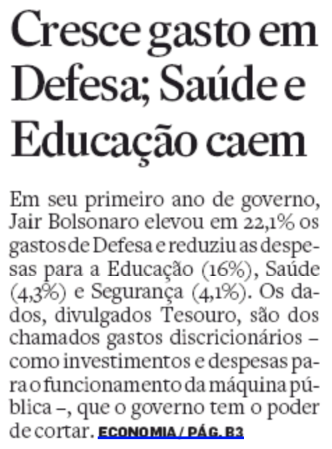 Cresce gasto em Defesa; Saúde e Educação caem.
