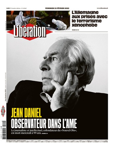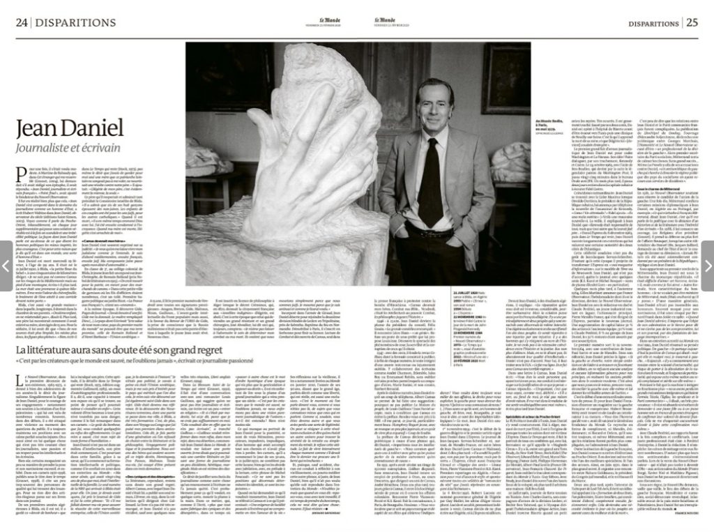 A morte do jornalista Jean Daniel, fundador da revista Le Nouvel Observateur, aos 99 anos, foi pra capa do Libération e mereceu duas páginas no Le Monde.