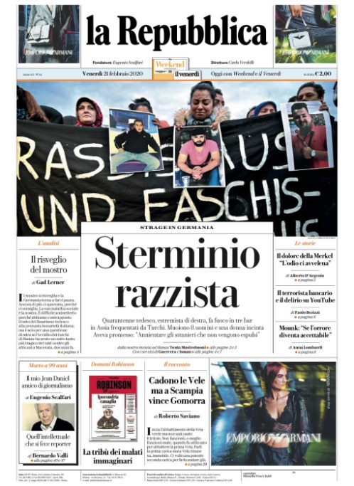 O jornal italiano La Repubblica abre espaço na primeira página para os atentados racistas de quinta-feira na Alemanha.