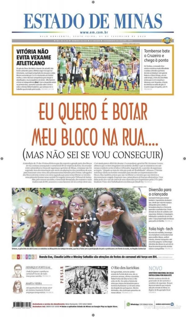 Na primeira página do Estado de Minas, um bom título para a ameaça da prefeitura de proibir alguns blocos de carnaval