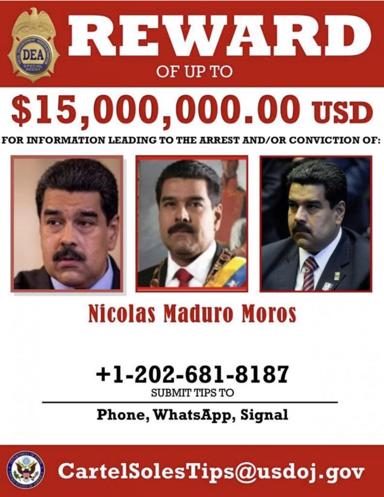 A Justiça americana oferece 15 milhões de dólares pela captura do presidente venezuelano. No cartaz de “procurados”, Maduro aparece como ex-presidente. Os Estados Unidos não reconhecem Maduro como presidente da Venezuela. Para o governo americano, quem ocupa esse cargo é o autodeclarado presidente Juan Guaidó.