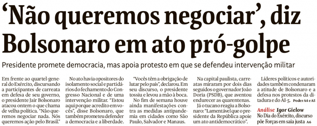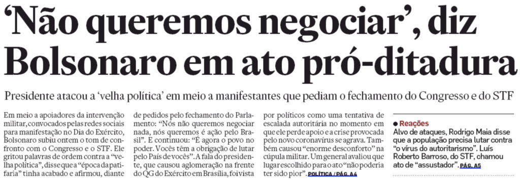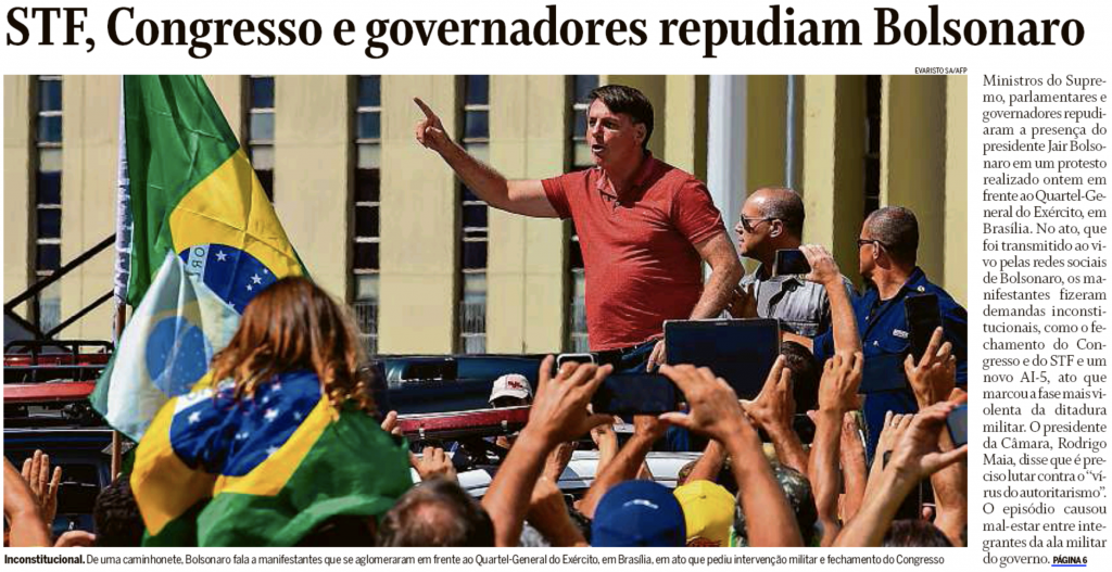 O presidente Bolsonaro desrespeita a OMS, participa de manifestação pedindo a volta da ditadura e o fechamento do Congresso e do STF.