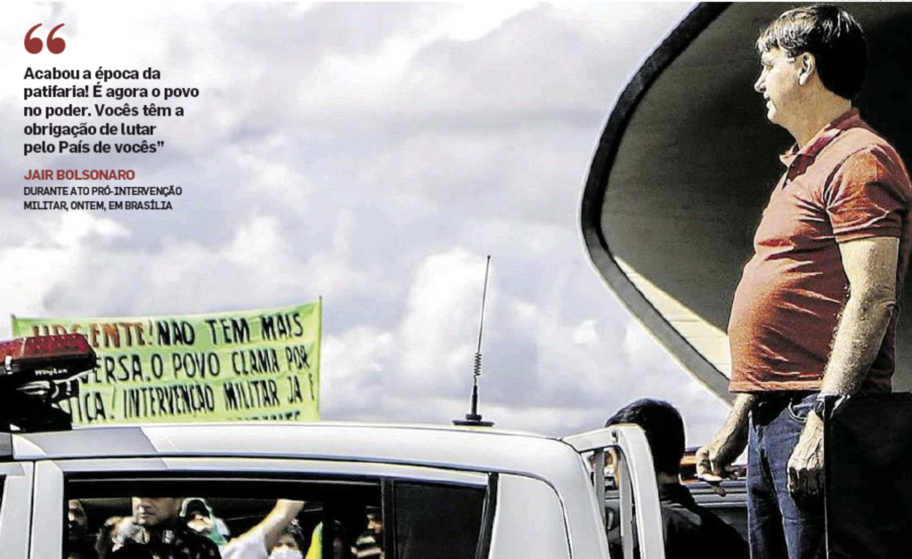 Na foto em destaque, Bolsonaro admira os cartazes pedindo intervenção militar.