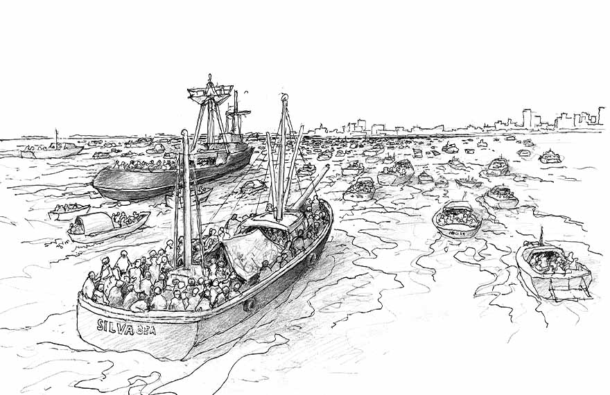 As duas primeiras embarcações a cruzar a estreita entrada da baía de Mariel foram o camaroeiro Blanchie III e o rebocador Dos Hermanos. Ambos tinham zarpado do sul da Flórida um dia antes, e para chegar a Cuba enfrentaram um mar tormentoso e picado, com ondas de até dez metros e ventos de vinte nós de velocidade. A despeito do céu escuro, de nuvens baixas, uma vista aérea revelaria que o Blanchie III e o Dos Hermanos eram apenas os primeiros da fila. Atrás deles, a proa de um grudada na popa do outro, vinham milhares e milhares de barcos. A flotilha gigante começava em Mariel, atravessava os 140 quilômetros do estreito da Flórida e só terminava em Caio Hueso, corruptela cubana para Key West, a mais meridional das cidades norte-americanas. Antes que a noite chegasse, inacreditáveis 2.500 embarcações se amontoavam nos exíguos oito mil metros quadrados de superfície da baía de Mariel, a cinquenta quilômetros de Havana. Do outro lado da boca de acesso a Mariel, outros mil barcos aguardavam vagas para atracar. Os marielenses jamais tinham visto tantas embarcações juntas, nem mesmo no Torneio Internacional Hemingway de Pesca de Marlins, que costumava atrair barcos de todo o mundo à costa noroeste de Cuba. No entardecer daquele 22 de abril de 1980, a baía de Mariel parecia um bosque de mastros e chaminés. De todos os tamanhos e calados, as embarcações chegavam vazias, algumas transportando apenas o capitão e um marinheiro, e voltavam atulhadas de pessoas. Dezenas, centenas, milhares e milhares de pessoas que deixavam Cuba em direção aos Estados Unidos.