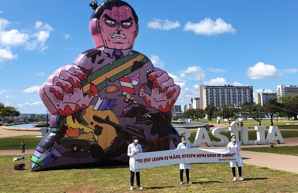 Foto do Dia Protesto em Brasília exibe um boneco gigante do presidente Bolsonaro com as mãos sujas de sangue, com uma citação de Bertold Brecht. Tags: Bolsonaro profissionais de saúde protesto contra Bolsonaro Notícias relacionadas Marielle Vive Viva Marielle A cidade de Turim, na Itália, agradece a ajuda dos médicos cubanos no combate ao coronavírus. Banho de espuma. Um ciclista sul-africano tenta se orientar na espuma que surgiu do mar e invadiu algumas ruas da Cidade do Cabo, depois de uma forte tempestade (foto: Nic Bothma EPA-EFE)