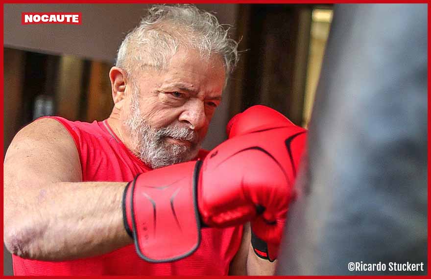 Lula está no ringue. Durante o confinamento, Lula faz lives, dá entrevistas para o Brasil e o exterior, participa de reuniões políticas com partidos e movimentos sociais. Para permanecer em forma e aliviar as tensões, faz esteira, puxa ferro e treina box (Foto Ricardo Stuckert).