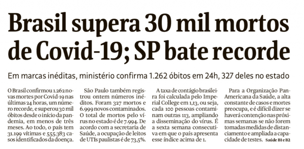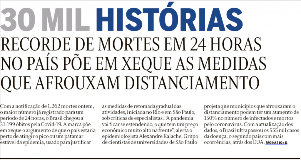 A cada novo recorde, o número de mortos pelo coronavírus volta às manchetes dos principais jornais do país.