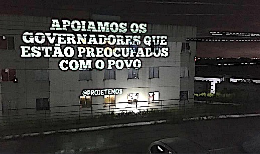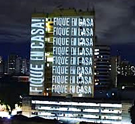 Na mesma hora, em Recife, quem passar às margens do Rio Capibaribe, que corta a capital pernambucana, lerá num paredão, também em letras gigantes: “#ForaCononavírus – FIQUE EM CASA!”.