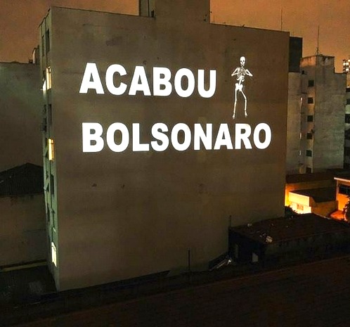 No meio da noite milhares de motoristas descem a rua da Consolação, em São Paulo. De repente dão com uma mensagem escrita em letras garrafais na parede de um prédio de escritórios de vinte andares – mais de cinquenta metros de altura: “FORA BOLSONARO!”.